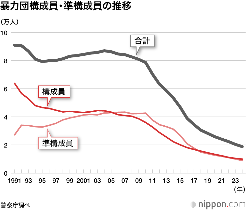 警察庁がこのほど公表した2024年の「組織犯罪の情勢」報告書によると、全国の暴力団構成員や準構成員らの24年末時点の人数は、前年比1600人減の1万8800人。20年連続で減少し、過去最少を更新した。構成員は同500人減の9900人となり、初めて1万人を割り込んだ。