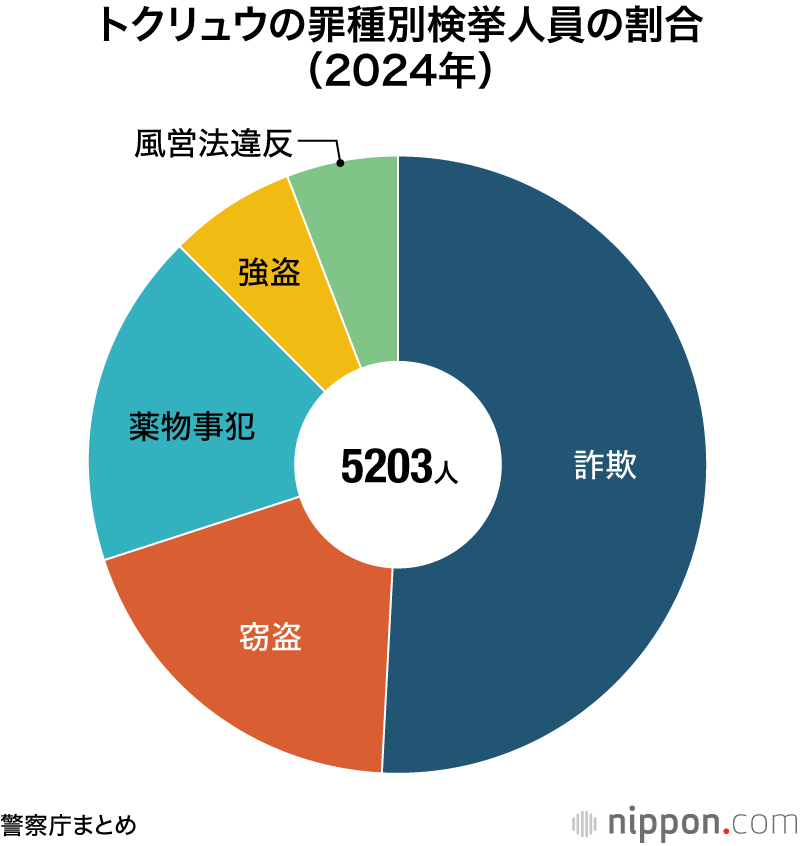 トクリュウによるものとみられる主な資金獲得犯罪に関わる2024年の検挙人員は、5203人。犯罪別の内訳は下図の通りで、詐欺が約半数を占めている。