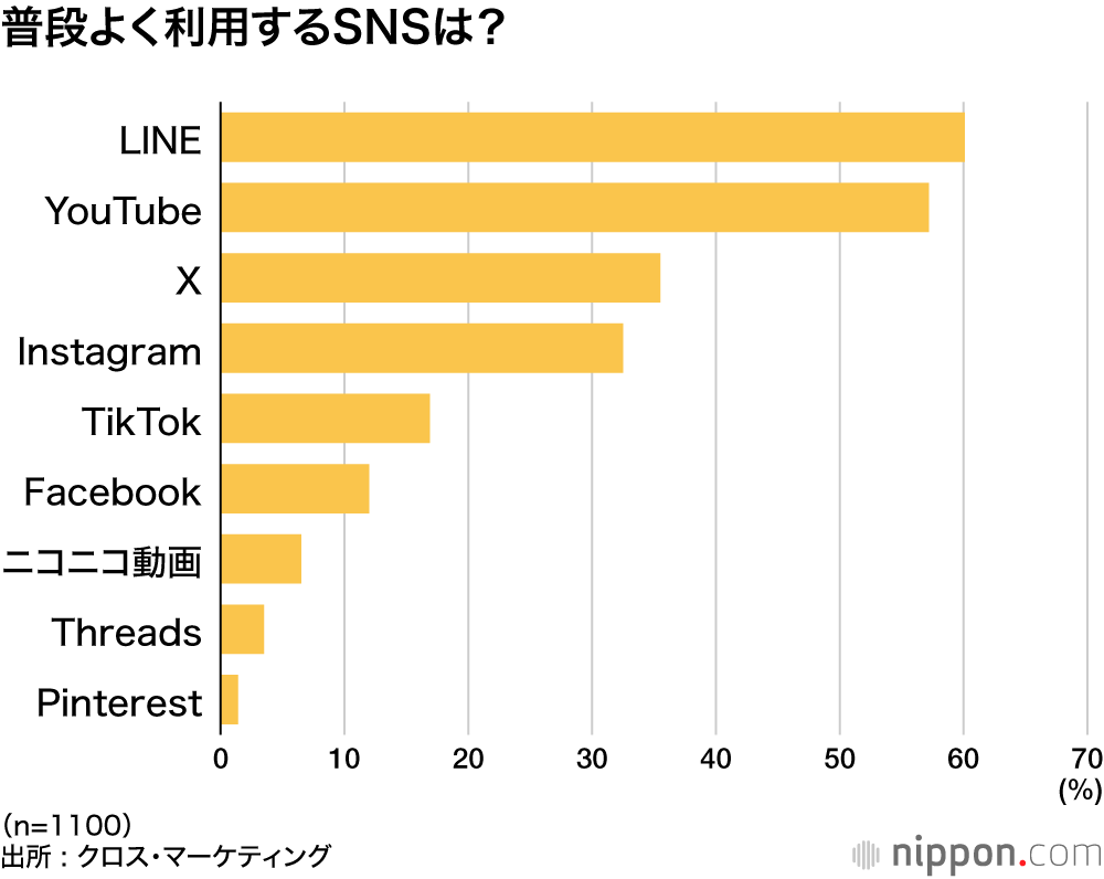 老いも若きも、電車の中でもカフェでも定食屋でもスマートフォンの画面とにらめっこ。マーケィング・リサーチ会社のクロス・マーケティング(東京都新宿区)が2025年4月に全国の20~69歳1100人を対象に実施した「SNSに関する調査」で、よく利用するSNSは「LINE」60.1%、「YouTube」57.2%が群を抜いて多かった。