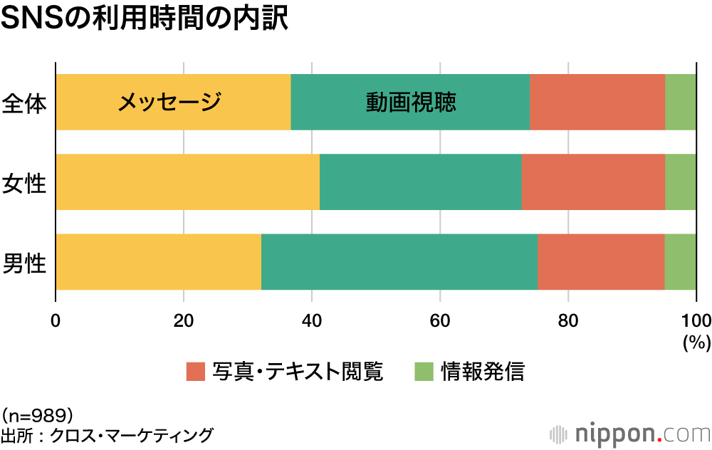 SNS利用時間の内訳は「動画視聴」「メッセージ」が2トップだが、女性は「メッセージ」41.2%、男性は「動画視聴」43.1%がそれぞれトップで、男女で1位と2位が入れ替わっている。