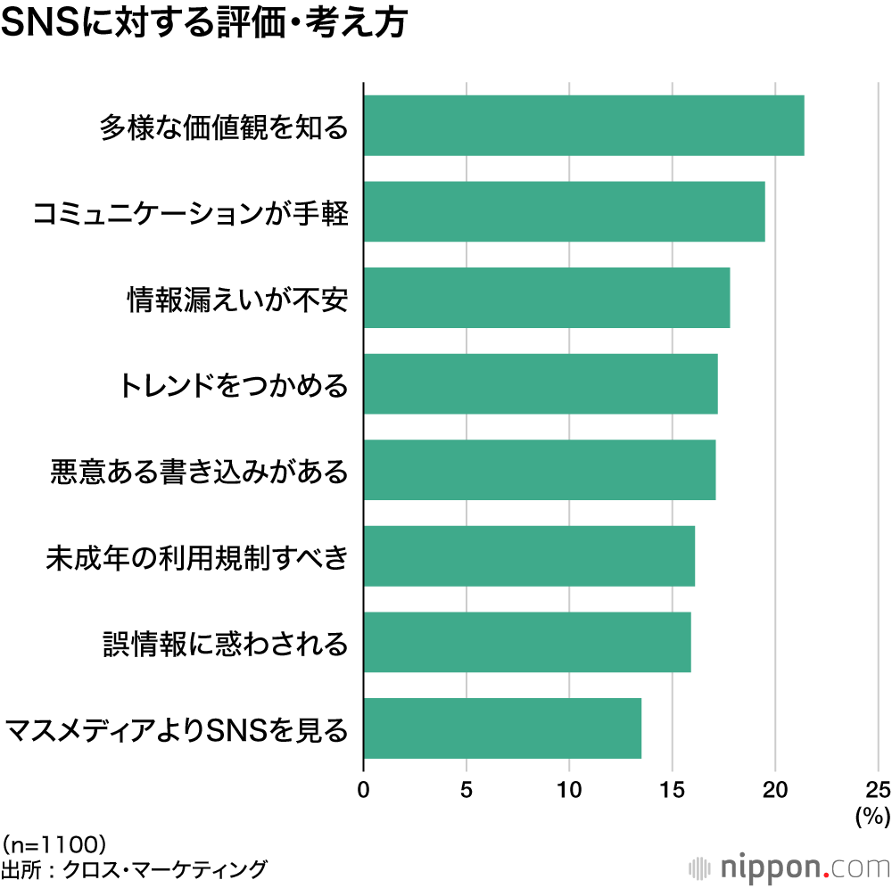 SNSに対する評価・考え方では、「多様な価値観を知る」「コミュニケーションが手軽」「トレンドをつかめる」などのメリットを評価する一方で、「情報漏えいが不安」「悪意ある書き込みがある」などデメリットを意識する人も。そのため、「未成年の利用規制すべき」も16.1%いた。