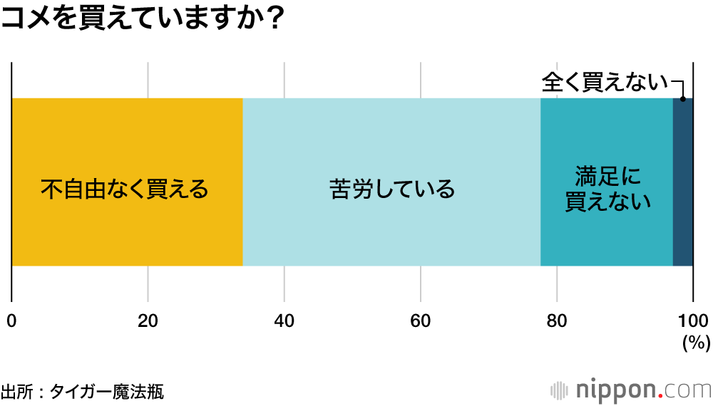 調理家電を主力とするタイガー魔法瓶(大阪府門真市)が5月末~6月初旬にかけて全国648人を対象に実施した調査では、「不自由なくコメが買える」と回答した人は33.9%にとどまり、66.1%の人は主食の購入に苦労していることが明らかになった。
