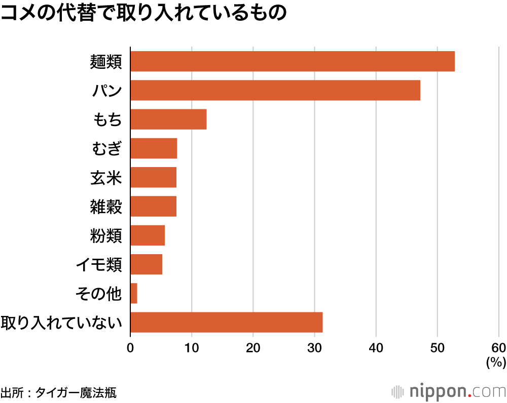 コメの価格高騰で約7割の人が代替食品を取り入れており、具体的には「麺(めん)類」52.8%、「パン」42.7%が多かった。価格高騰しても同じ銘柄のコメを食べ続ける代わりに、代替食材で支出のバランスを取っていようだ。
