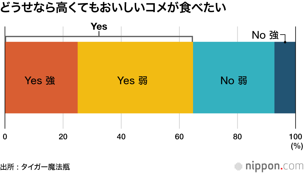 「どうせなら高くてもおいしいコメが食べたいか?」という問いに対しては、「非常にそう思う」25.0%、「ややそう思う」39.7%で、6割以上の人がおいしいコメへのこだわりを示した。