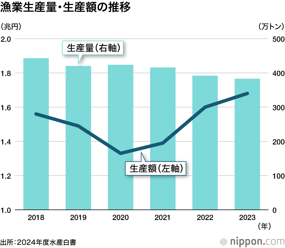 海面漁業の生産額は9534億円で、同4%増。海面養殖業はノリの価格上昇で同10%増の5956億円だった。内水面漁業・養殖業は1363億円で3%減だった。生産量は前年比2%減の383万トン。この量は、生産量ピーク時の1984年(1282万トン)の約3割に当たる。