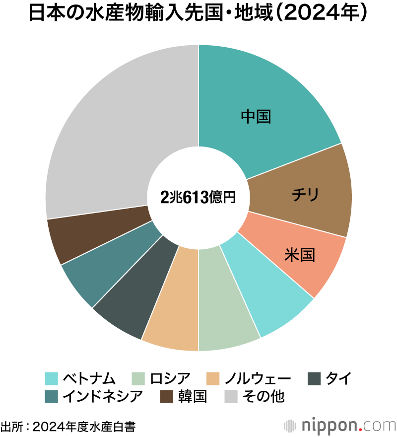 2024年の水産物輸入量(製品重量ベース)は前年と同量の216万トン、輸入額は同2.2%増の2兆613億円だった。主な輸入先は中国、チリ、米国など。品目はサケ・マス類、エビ、カツオ・マグロ類などが輸入額の上位を占めている。