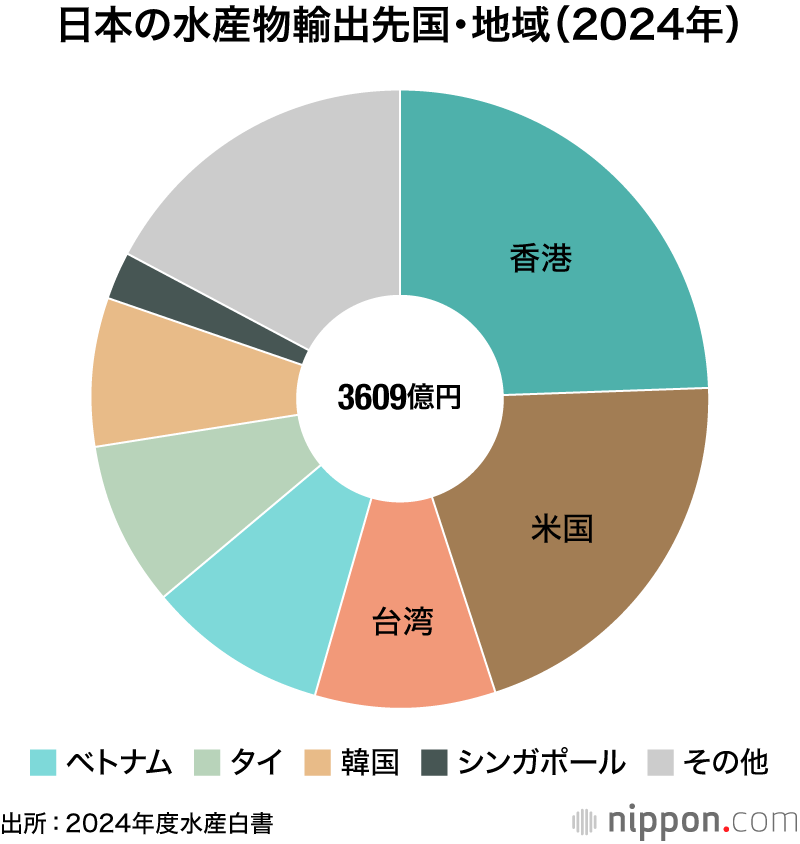 24年の水産物輸出量は前年比5.5%減の45万トン、輸出額は同7.5%減の3609億円だった。中国向けの輸出が、23年のALPS処理水海洋放出開始以降の輸入規制でほぼストップ。主な輸出先は香港、米国、台湾が上位になった。品目別ではホタテガイ、ブリ、真珠が輸出額の上位となった。