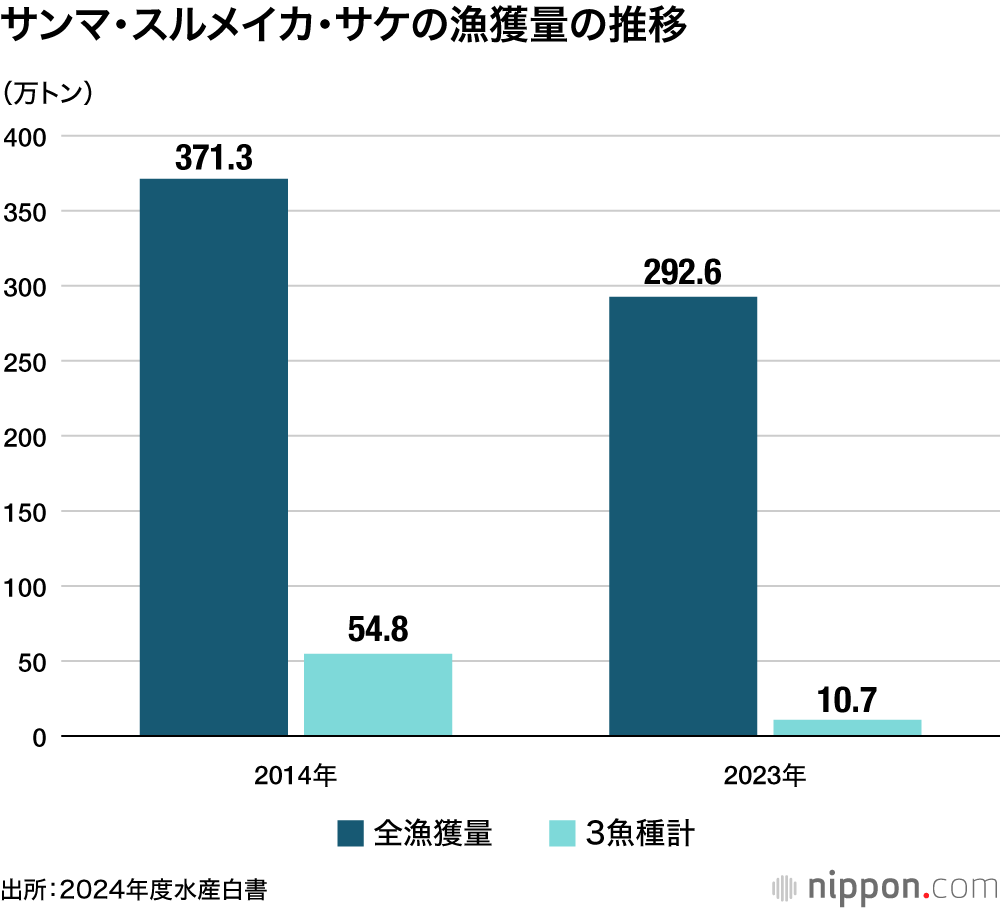 今回の水産白書は、海水温の上昇や海流の変化など、気候変動による水産業の変化を特集。サンマとスルメイカ、サケが近年不漁で、この3種を合わせた漁獲量は2014年の計54万8000トンから、23年には計10万700千トンと、5分の1に激減したと報告している。
