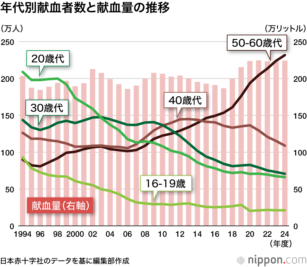 輸血用血液製剤や血液から特定のたんぱく質を抽出して作る血漿分画(けっしょうぶんかく)製剤の多くは高齢者の医療に使われている。少子高齢化の人口構造は容易には解消されないため、高齢者医療を支えるためには、若い世代の献血協力者確保が喫緊の課題となっている。
