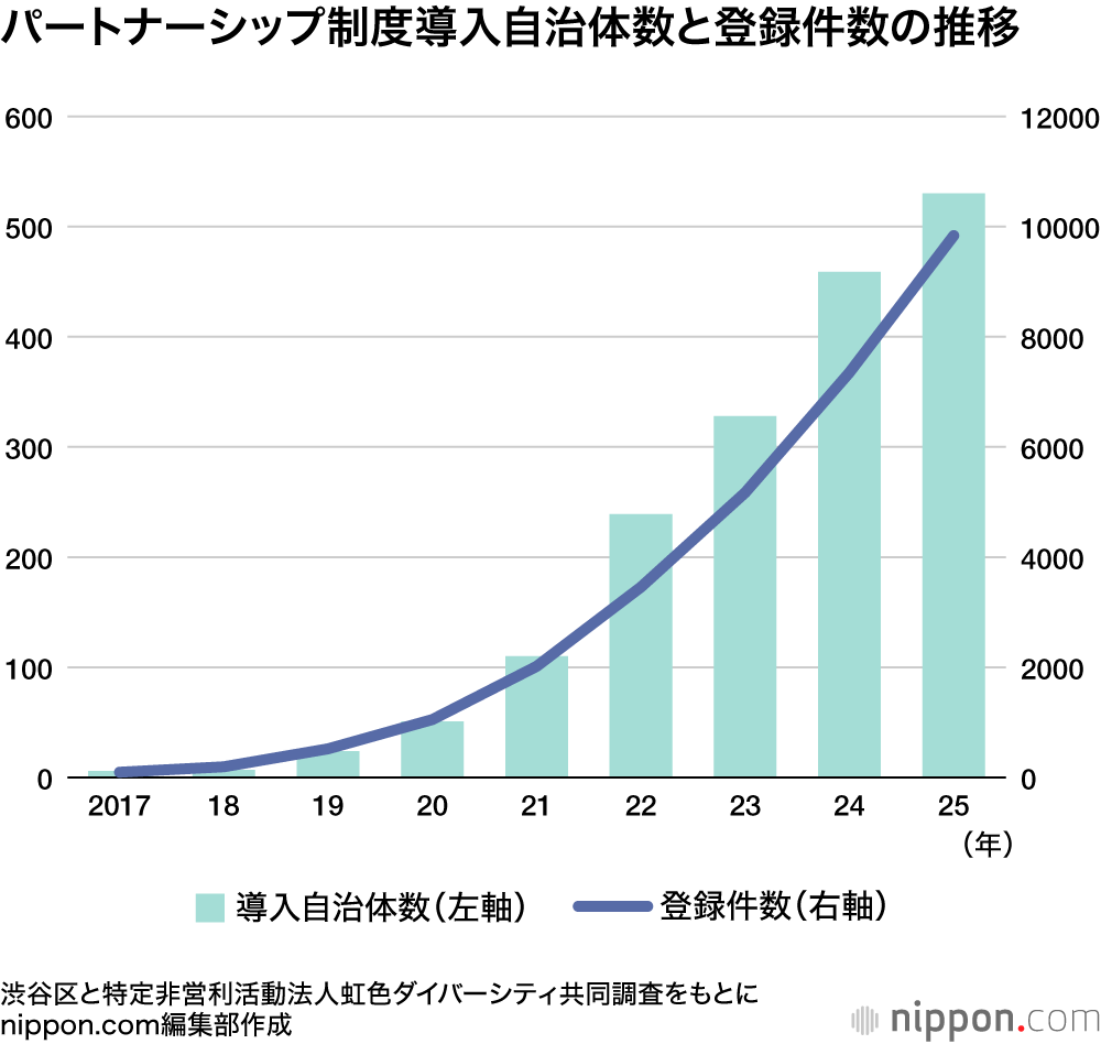 渋谷区と特定非営利活動法人虹色ダイバーシティが実施している共同調査によると、2025年5月末時点で、導入自治体は530。人口カバー率はこの1年で7.4ポイント上昇し、92.5%に達した。「パートナー証明」の交付件数(パートナー登録件数)は、5月末時点で9836組。