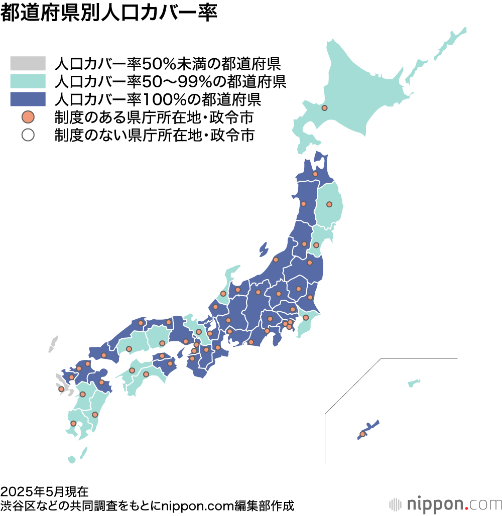 日本では同性カップルの婚姻(同性婚)は認められておらず、パートナーシップ制度はそれによる当事者の不利益の一部を「補償」しようという自治体の動きといえる。制度導入の動きは22年、1400万人の人口を抱える東京都が実施に踏み切ったことで、全国に広がった。