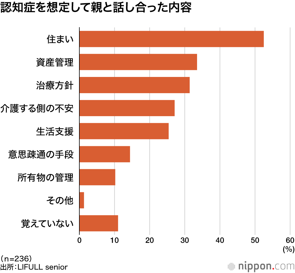 話し合った内容は、「住まい」が約53%とトップ。親が認知症になったとき、「自宅で暮らすか、施設に入居するか」は大きな関心事だ。