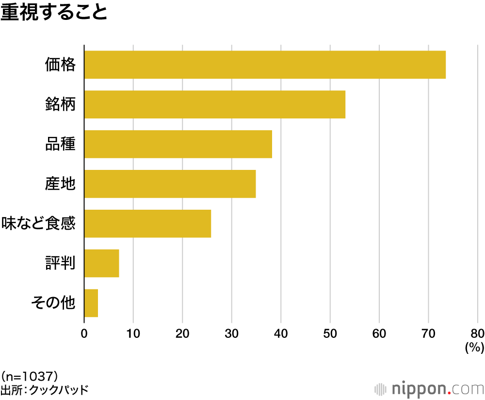 「新米を買うときに重視するポイント」として「価格」を挙げた人は73.5%と7割以上。次いで「銘柄(ブランド)」53.1%、「品種」38.2%、「産地」34.9%を意識した人が多かった。ちなみに「魚沼産コシヒカリ」といえばブランド、単に「コシヒカリ」といえば品種を指す。