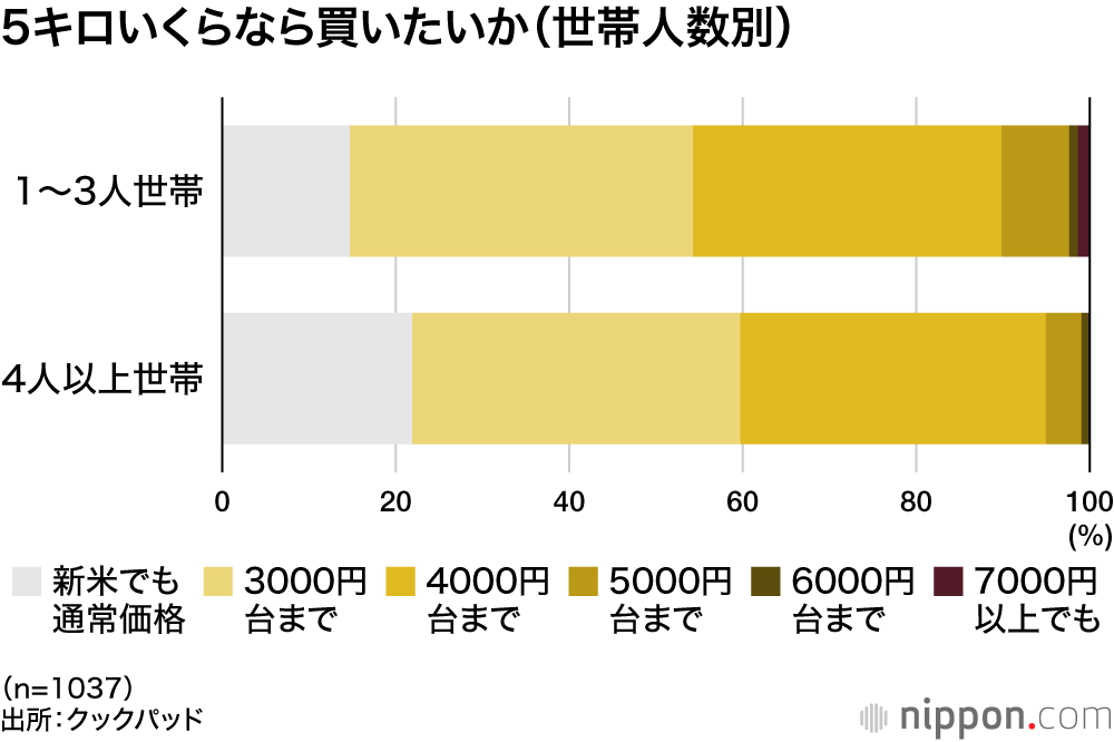 「新米5キロ、いくらなら買いたいか」を世帯人数別に見ると、「3000円台まで」と「4000円台まで」の合計は「1~3人」の少人数世帯で75.2%、「4人以上」の大人数世帯で73%と、そう変わらない。