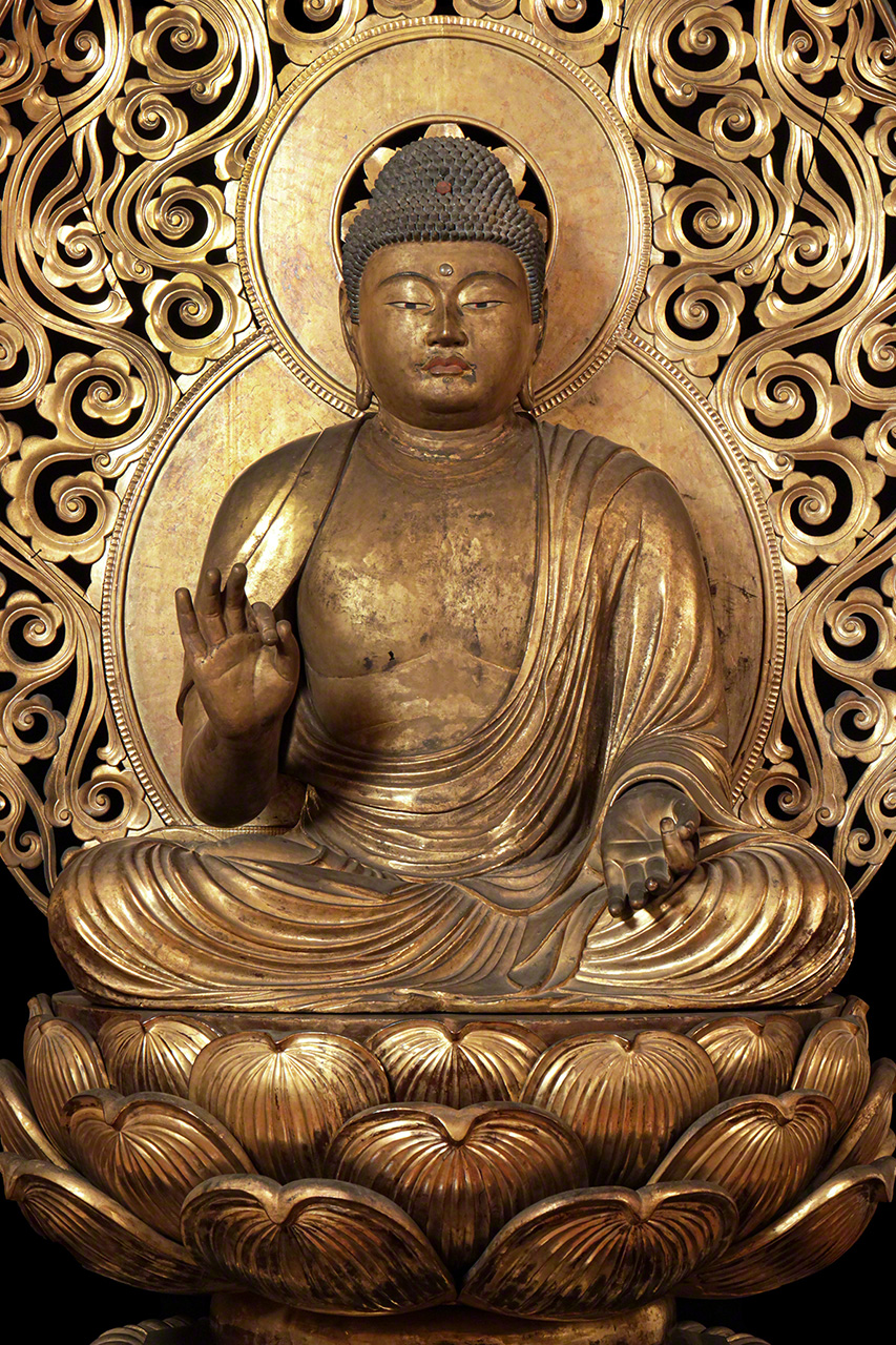 阿弥陀如来像は、右肩をあらわにして袈裟(けさ)をまとい、右手を挙げて左手を下げた「来迎印(らいごういん)」を結ぶ。これは臨終に際し、阿弥陀如来が極楽浄土から迎えに来る姿とされる。