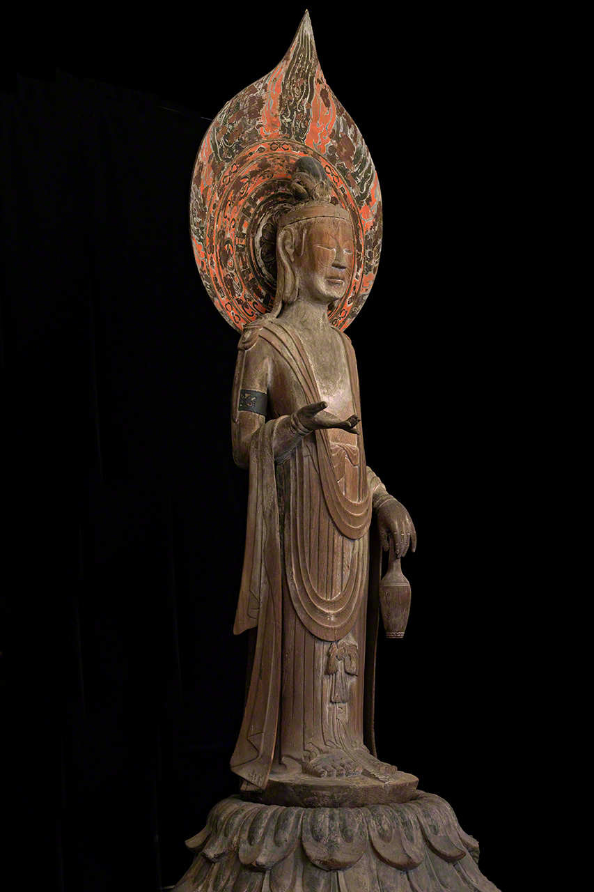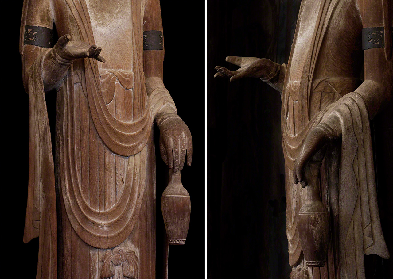 左手で軽くつまむように水瓶を持ち、右の腕を曲げ手のひらを上に向けている姿は、法隆寺の国宝・百済観音像を写し取ったかのようだ。