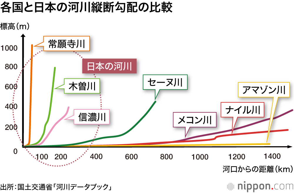 æ¥æ¬ã®å¹Žééæ°Žéã¯äžçå¹³åã®ã»ãŒåã«ããã1700ããªã¡ãŒãã«ãã«ããããããæžæ°Žãé »çºããã®ã¯ãæ²³å·ãçãæ°Žãäžæ°ã«æµ·ã«æµãåºãŠããŸãããã ãå·ãæµ·ãŸã§å°éããè·é¢ãäžçã«æ¯ã¹ãŠéåžžã«çããæ¥æ¬äžã®é·ãã®ä¿¡æ¿å·ïŒ367ããã¡ãŒãã«ïŒãããäžççã«èŠãã°ãæ¥æµããªã®ã ãå¯å±±çãæµããåžžé¡å¯ºå·ïŒ56ããã¡ãŒãã«ïŒã¯æšé«3000ã¡ãŒãã«ããæµãäžããææ²»æã«ãã®å·ã®å·¥äºã«éããããªã©ã³ã人æåž«ããããã¯å·ã§ã¯ãªããæ»ã ïŒããšå«ãã ãšäŒããã