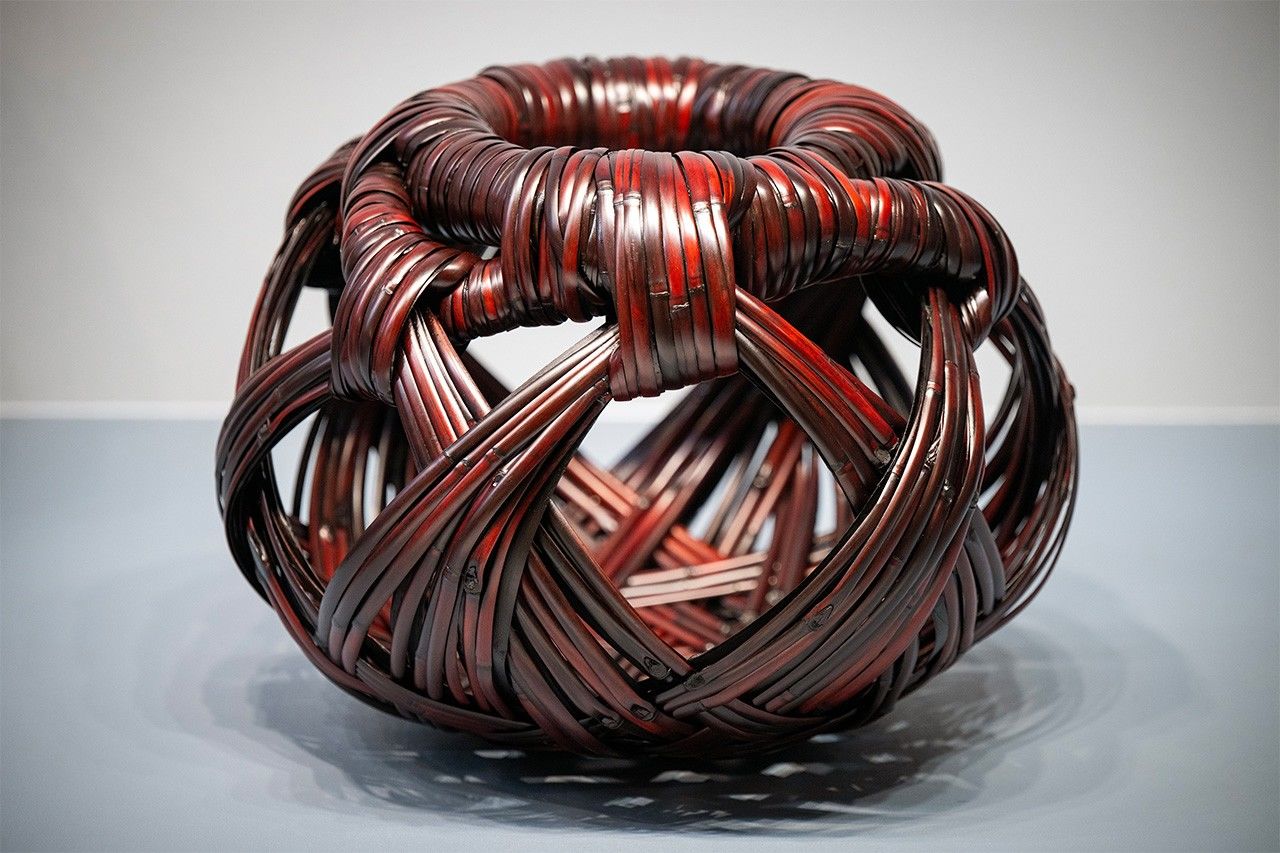 そのコッツェン氏が最初に購入し、海外との架け橋となった作品が花籠「春潮」である。茎の根本が大きく曲がる根曲竹(ねまがりだけ)を素材に、自在に編む荒編(あらあみ)の技法で力強くまとめることで、竹の持つエネルギーを鮮やかに表現している。