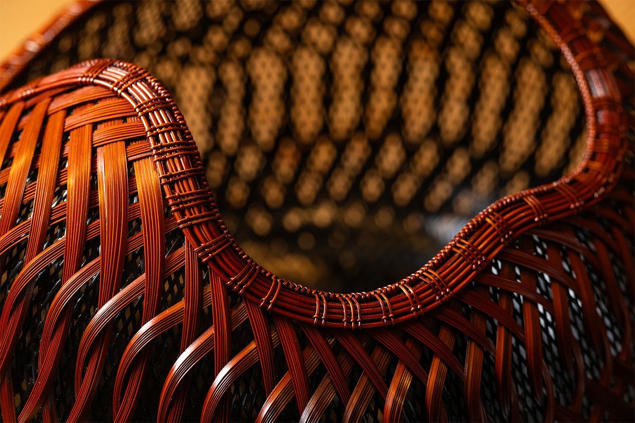 その独自技法が用いられた近作が、束編花籃「五行」である。「五行」は、細く割って染色した竹ひごを、二層構造で編み上げた作品だ。伝統技法を応用した透かし網代(あじろ)で編まれた内側は、竹の繊細さを、束編にひねりを加えた独自技法で編んだ外側は、竹の強靭さを表現。伝統的な花籠には見られないユニークな造形が、竹の有機的な美しさをより一層際立たせている。