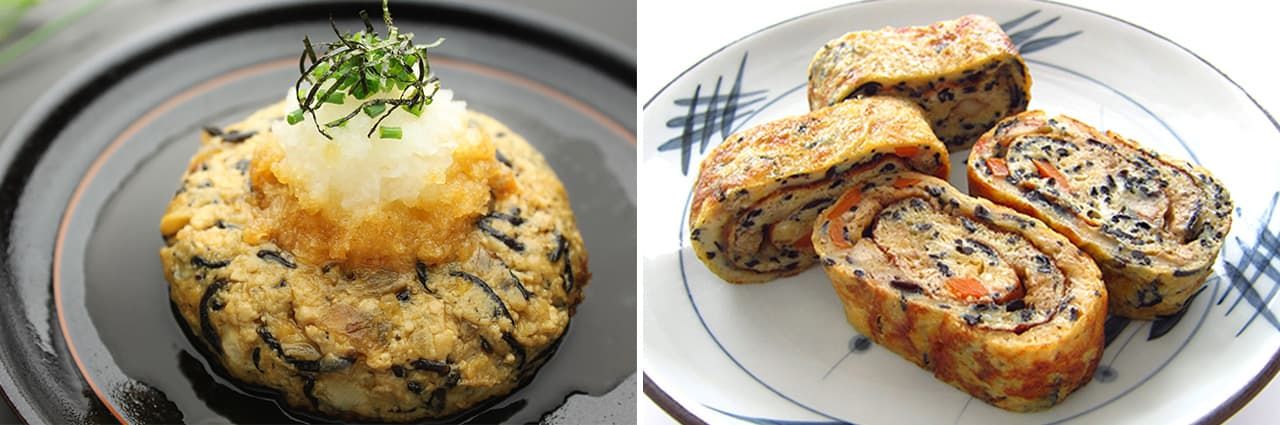鶏ひき肉と豆腐で作る和風ハンバーグ、朝食やお弁当のおかずに人気のだし巻き卵にも、しばしば混ぜ込まれる。具材にひじきをプラスすると見た目のアクセントになり、栄養価も高まる。