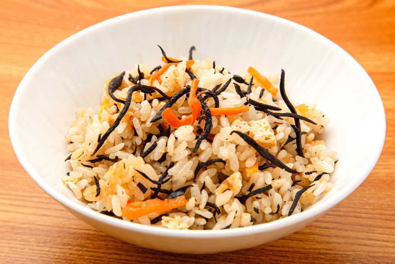 ひじき煮と似たような具材を入れた、炊き込みご飯。ひじきふりかけを混ぜただけの簡易版も。