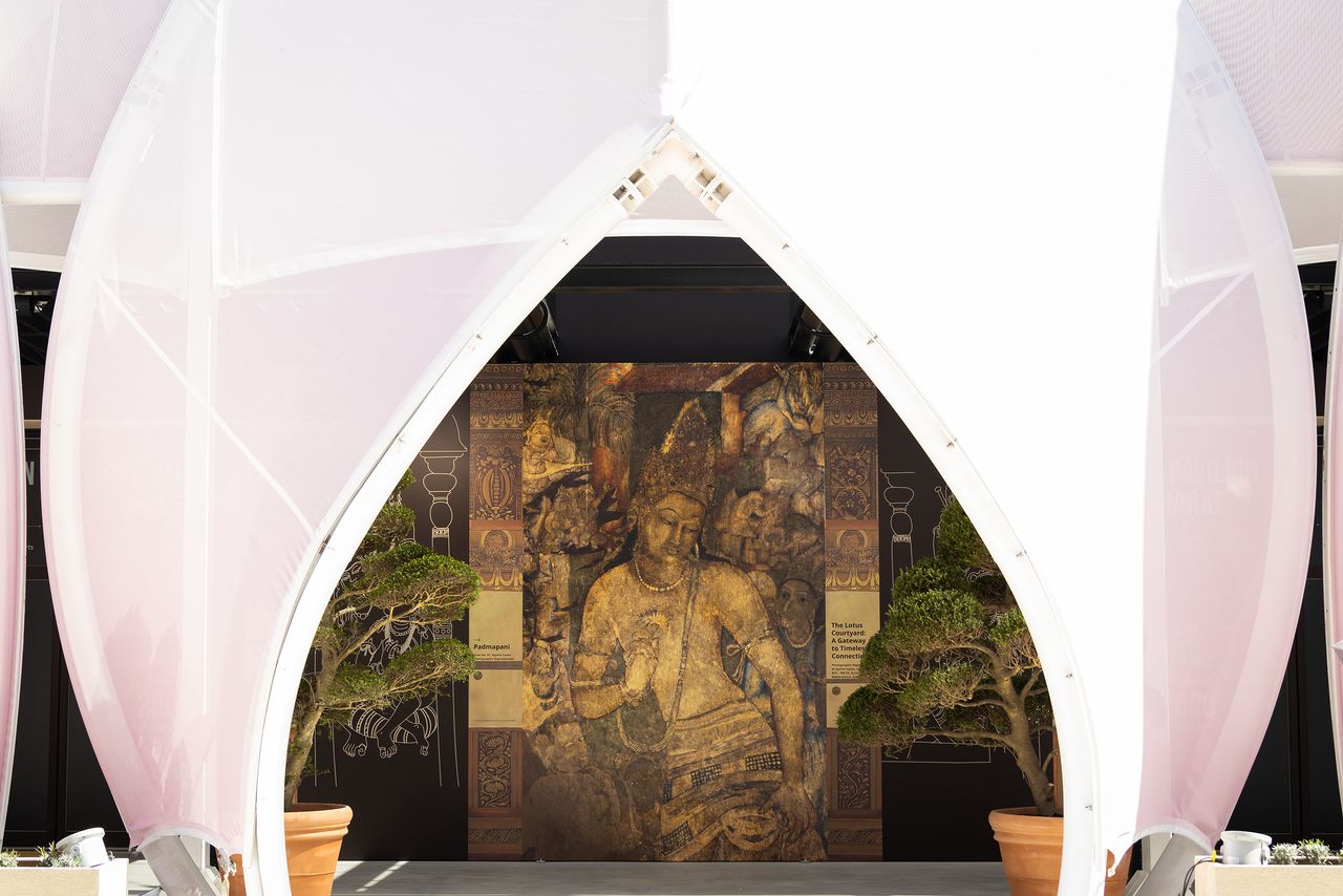 外観はヒマラヤ山脈を模し、山の薬草で人々を救った猿の神様「ハヌマーン」や、古代の仏教壁画が描かれる。