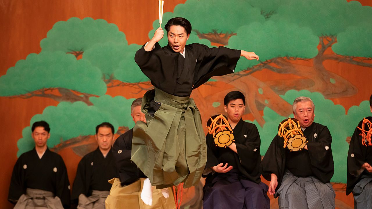 鷹之資さんは、5月に『勧進帳(かんじんちょう)』で義経の家来・駿河次郎を演じ、6月には義太夫狂言の名作『菅原伝授手習鑑(すがわらでんじゅてならいかがみ)』の一幕、「車引(くるまびき)」に出演。三つ子の兄弟の中で一人敵側に仕える松王丸を勤め、「隈取り(くまどり)」の顔で力みなぎる見得を切り、大きな存在感を見せた。