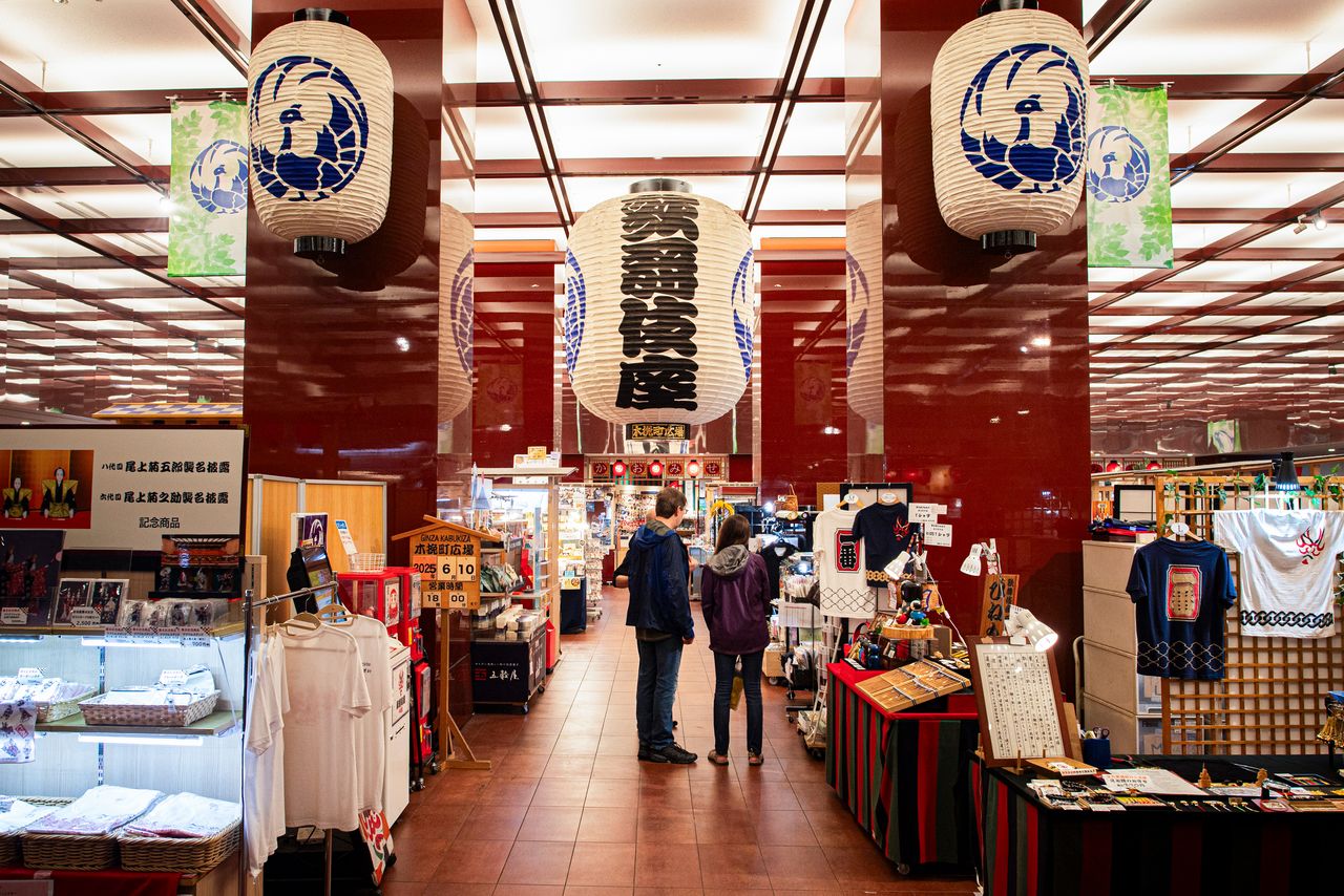 東京メトロ日比谷線、都営浅草線の「東銀座」駅に直結している「木挽町広場」は、歌舞伎座タワーの地下2階にある。大提灯(おおちょうちん)が目印で、縁日のような心浮き立つ雰囲気だ。歌舞伎グッズや和雑貨、和菓子など、目移りするほど多彩なお店が並ぶ。