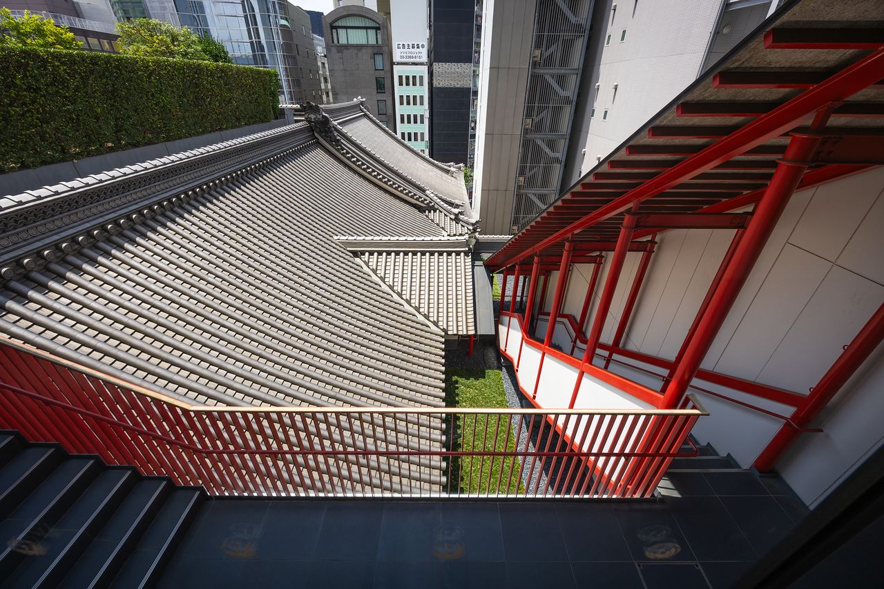 四階回廊と屋上庭園を結ぶ五右衛門階段。大盗賊・石川五右衛門の有名なセリフ「絶景かな、絶景かな」にちなんだ名前で、歌舞伎座の大屋根が間近に見える 写真:ニッポンドットコム編集部