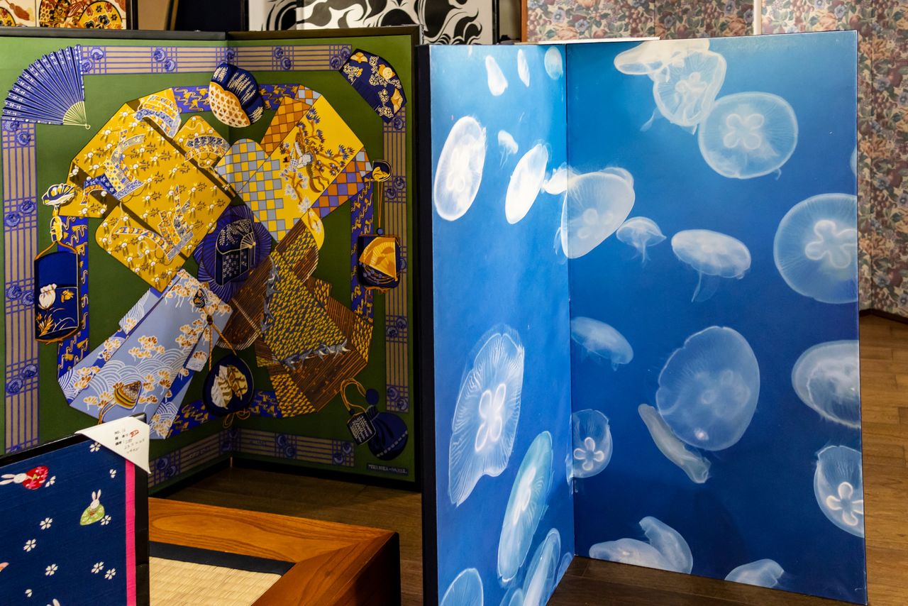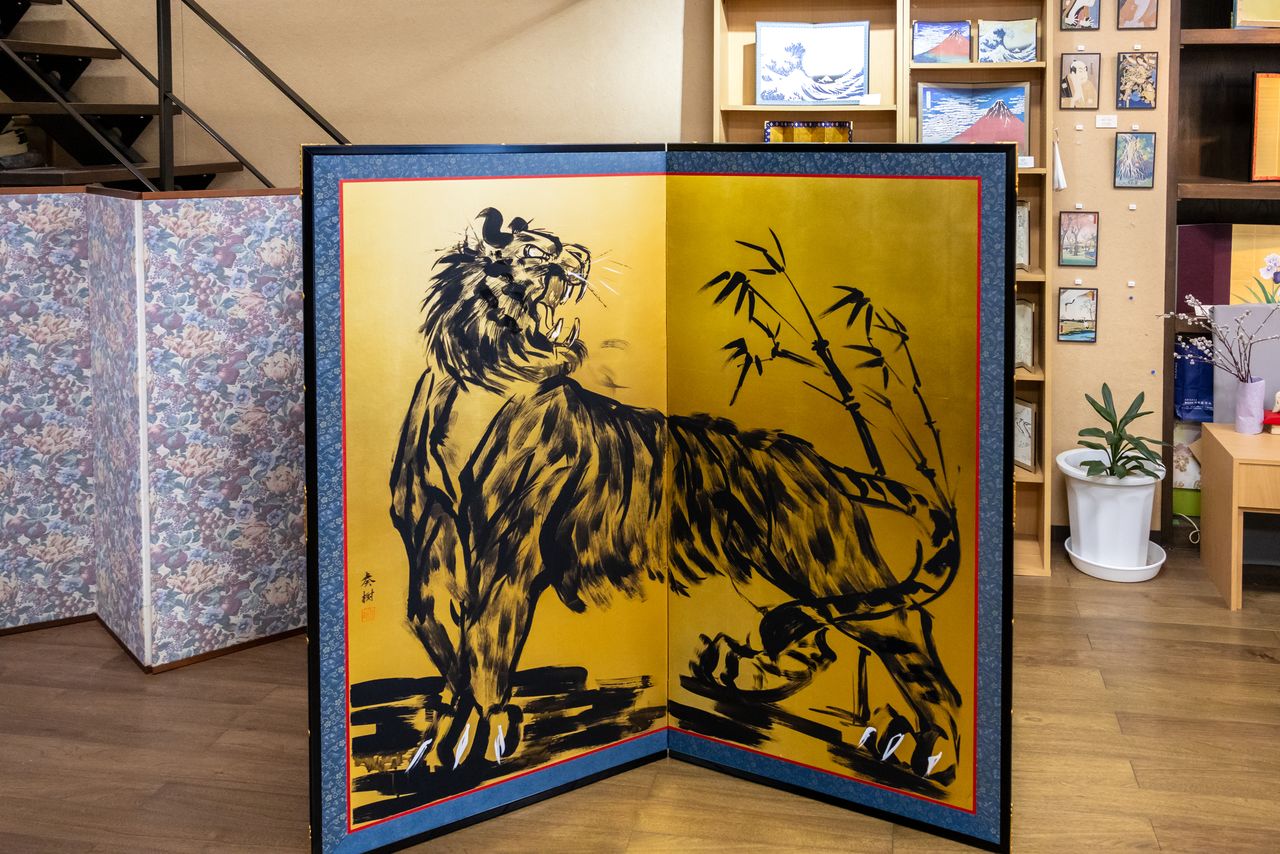 現代アーティストの作品を屏風に。参考展示だが、販売を希望されることもある