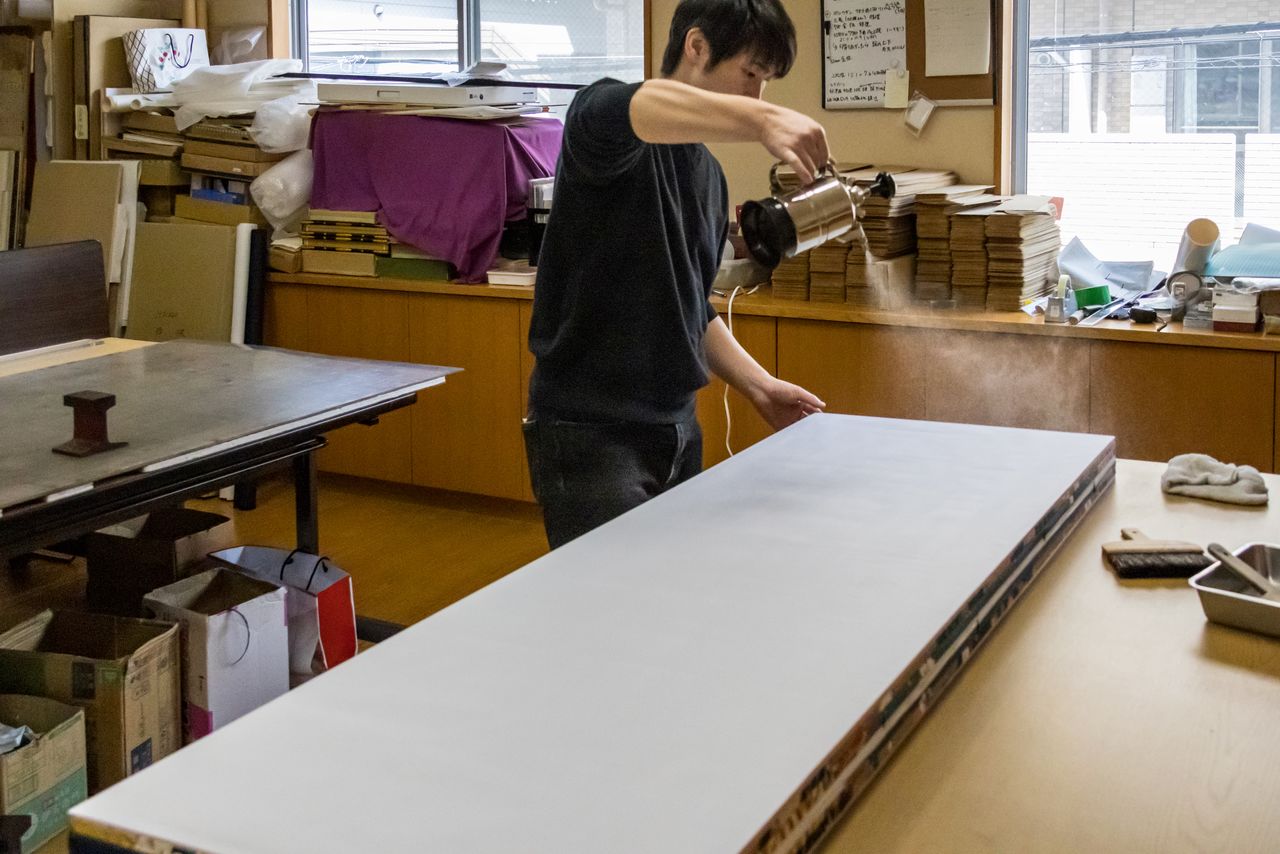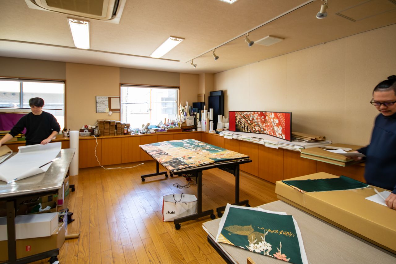 2階の工房では、職人が表具に和紙を張り付ける作業にいそしんでいた。目を見張るのは、着物の生地を独自工法で「紙」へと変え、唯一無二の作品へ仕立て上げる技。和紙を霧吹きでぬらし、屏風へなじませる工程は、湿度などを考慮した豊富な経験と繊細な技術が求められる。